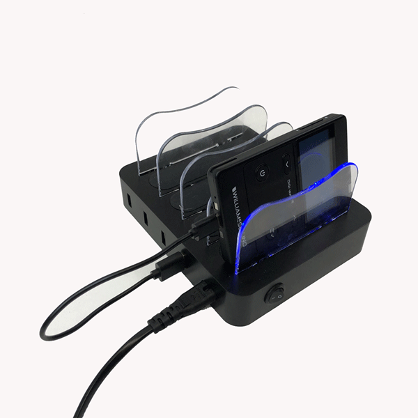 The CHG 3512 and CHG 3512 PRO multi-unit, drop-in style charger will conveniently store and charge up to 12 Williams Sound PPA R37, PPA R38, R35-8, R36, R863, RX22-4 receivers, or PPA T36, PPA T46, PFM T36, T863 transmitters over the course of a 16-hour time span. The charger helps keep receivers organized and saves cost on having to