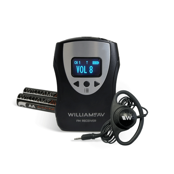 with any Williams Sound FM wideband transmitter. Receivers include a detachable belt-clip for hands-free operation. A standard 3.5 mm stereo phone jack accommodates low-impedance mono earphones,