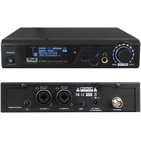 ALT-9000 Base Station Transmitter. Designed as an add on to permanently installed PA and/or sound systems, the compact half rack space base station will easily fit in or on top of a rack, next to a sound board, under a lectern, or on a rolling cart. Hookup to the PA system's line feed is simple as the transmitter features two combo XLR input jacks with individual gain/volume controls located on the back panel. The default frequency is 902.00 MHz but like the ALB-9000 beltpack receiver and the WB-90000 beltpack transmitter, the frequency can easily be changed when multiple systems are to be installed in same vicinity. Should it become necessary to change the frequency, the receivers can quickly be synchronized to the new frequency via an infrared port located on front of the transmitter.