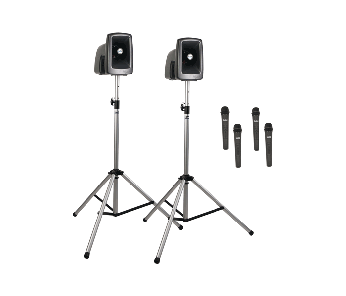 Wireless two-speaker PA system with Bluetooth and four (4) wireless microphones