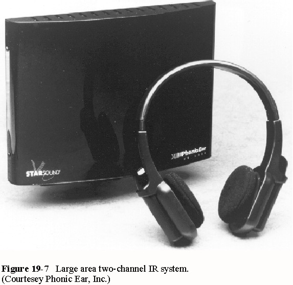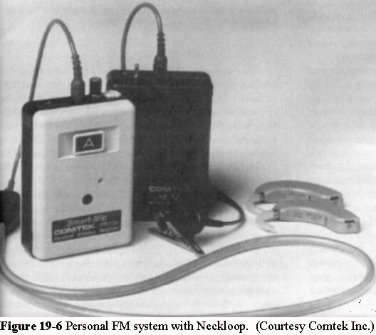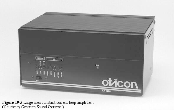 SIGNAL TRANSFER METHOD There are two principal methods of routing the signal from the source pickup to the sound generating transducer/coupler. It can be either hardwired or wireless transmission. Because most sound generating transducers are low impedance devices and require a stronger signal than that of the output of a microphone, an amplifier is required. Most amplifying devices have a volume control allowing the signal to be adjusted by or for the individual person's needs. Some device manufacturers also incorporate tone controls and balance controls to better accommodate the individual user's needs. Hardwired Systems As the name indicates, the hardwired devices make the connection between the sound source and the output by means of a wire or cable. The terms wire or cable are usually associated with commercial installations. But due to the relative small size of the cables associated with personal ALDs, these are referred to as cords. The cord connecting the source signal to the amplifier is shielded to avoid inductive interference caused by other electrical installations. The cord connecting the output transducer to the amplifier does not need to be shielded because of the low output impedance of an amplifier. In the past, facilities, particularly churches, provided assistive listening by means of hardwired headset connections. Therefore, people with hearing loss were limited to seating at designated seats, usually within the first five rows. Large bulky headphones were the most common listening option, thus, these systems were never popular among people with hearing loss. But the development of cost-effective wireless systems in recent years has eliminated the need for commercial fixed hardwired systems. However, a personal portable amplifier is an economical solution for person-to-person conversations in noisy environments. The basic system consists of a pocket sized amplifier, a microphone, and an appropriate sound generating output transducer (see Figure 19-2). The microphone is often designed as a plug-in unit which eliminates the need for the microphone cord. In noisy environments, the microphone/amplifier is held close to the speaker's mouth thereby improving the SNR substantially. The plug-in microphone can also be attached to a short cord or simply replaced with a wired lapel microphone. This provides the user the option to use it as a hand-held microphone or as a lapel microphone. Pearl... A person with hearing loss is having difficulty understanding in even close person-to-person conversations in situations where the background noise level is unusually high, i.e. at restaurants, parties, and conferences. The person has hearing aids with T-coils but no Direct Audio Input (DAI) (described later in this chapter). A personal amplifier with plug-in microphone and a neckloop is a sensible solution. For TV or radio listening, a microphone extension cord can be inserted allowing the microphone to be placed close to the loudspeaker. Most newer TVs, VCRs and other audio equipment also have "audio output" jacks. The patch cord may be connected directly to such an output jack, thereby eliminating the need for the microphone as the pickup source. In spite of the high portability of these devices, the user has limited mobility to move around once the system is in place. Wireless Technologies The optimal solution to provide full mobility to the ALD user is by routing the signal from the sound source to the user by means of wireless transmission. There are three basic wireless technologies available today which provide different methods of transmission: Teleloop (induction loop) technology, FM broadcast technology, and infrared light technology. No single technology is best for all applications. Each type has its own advantages and disadvantages. All three types of assistive listening systems can successfully be applied, as long as their individual limitations are observed. INDUCTION LOOP SYSTEMS (Teleloop) The induction loop technology is the oldest and perhaps the most popular (among people with hearing loss) of the three wireless technologies. It is based on electromagnetic or inductive transmission and has the unique advantage that the signal is received directly by the user's personal T-coil on the hearing aid without the need for an additional receiver as is required by all other wireless technologies. Induction loop receivers are available for people with hearing loss without hearing aids or without the T-coil feature. The most common loop receiver is a pocket sized belt-clip device with headset or earphone. However, loop receivers are also available in a wand-like style or as a standard canal instrument (no microphone or volume control). Typical applications for induction loop systems include home radio/TV listening, small to medium size auditoriums, houses of worship, senior centers, council chambers, automobiles, and an endless number of counter applications where a physical barrier separates service personnel and individual customers, or where environmental noise may be excessive. The Concept of the Induction Loop The transmission component of an induction loop (room loop) system consists of an amplifier and a discrete wire (the loop) that runs along the perimeter of a room or designated area. The audio signal from the sound source is routed to the input of the amplifier and the amplifier's output is connected to the room loop. When an audio signal is delivered to the input of the amplifier, an alternating current (AC) flows through the loop. This current generates an inductive field inside the loop which is being picked up by the T-coil in the hearing aid or by a special loop receiver as illustrated in Figure 19-2. Conceptually it works like a transformer, where the loop simply is the primary coil of a transformer, and the T-coil the secondary coil of the transformer. Electromagnetic Field Strength and Frequency Response of Room Loops In order to take advantage of using per