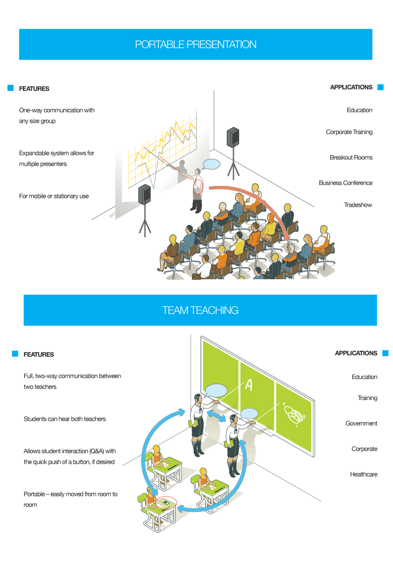 Guided Tours - with one or more tour guides (2-way), with audience participation (2-way), or without audience participation (1-way). Tour mode is best suited when one or two people are leading a large group. The tour group mode can be configured to only listen to the leader(s) of the group, such as on a museum tour. Alternatively, this mode allows people with a transceiver to speak, which may be useful for tours through noisy areas where hearing may be difficult, such as factory tours.